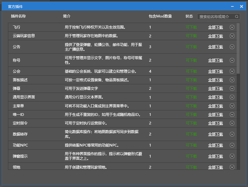 目前工作台中提供的官方插件和第三方插件已经涵盖了大部分的类型,包括但不限于:聊天、工具、世界管理、经济、机制等等。