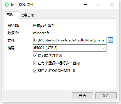 (5)选择【文件】,在框内粘贴mod.sql文件,并点击【开始】。