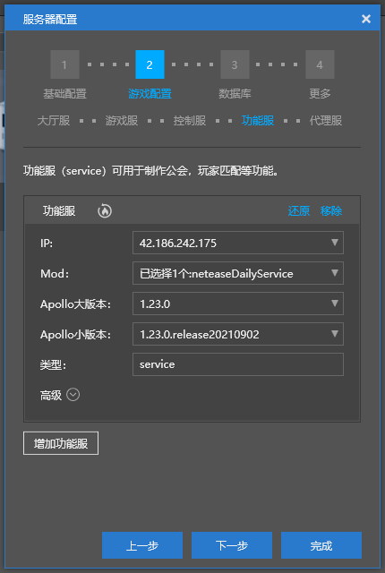 ③ 如果按照教程创建的空白模板,没有功能服,则新增一个【功能服】,在“Mod” 选项中勾选【neteaseDailyService】。