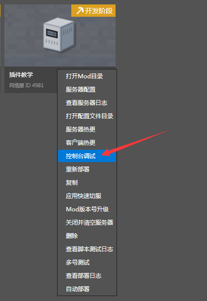 (1)在【网络服开发】标签页中,我们右键点击其中一个网络服,选择【控制台调试】。