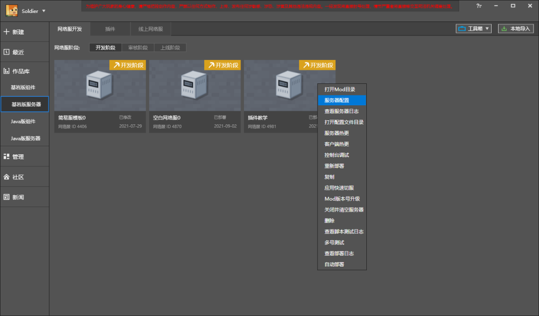 (6)关闭Navicat界面,回到《我的世界》开发工作台的【基岩版服务器】界面,在上方【网络服开发】标签页中,找到我们创建的网络服,并右键选择【服务器配置】。