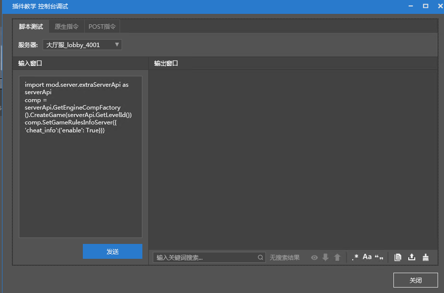 (2)在【脚本测试】标签页下,选择一个服务器(这里以大厅服为例),输入以下代码,点击【发送】。