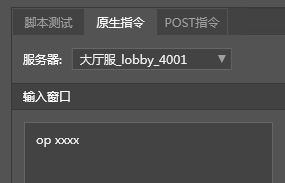 (3)在【原生指令】标签页下,选择服务器(这里以大厅服为例),输入“op玩家名”。