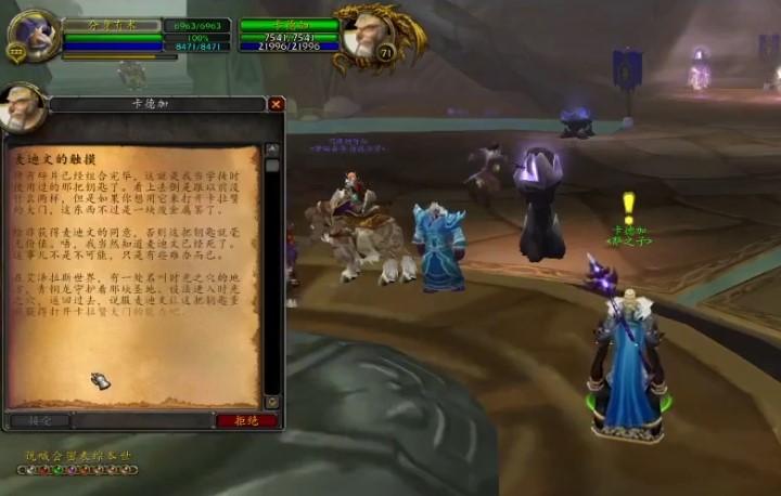 1、玩家首先要在沙塔斯城的圣光广场中与NPC卡德加对话接取麦迪文的触摸任务。