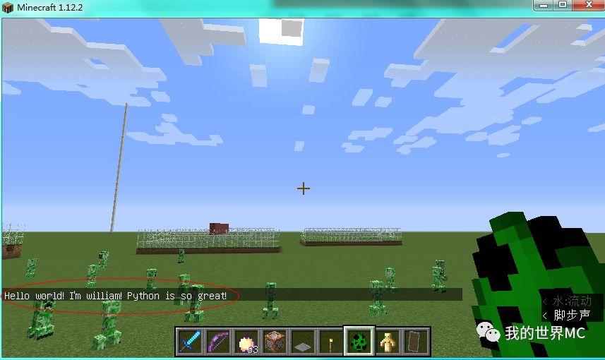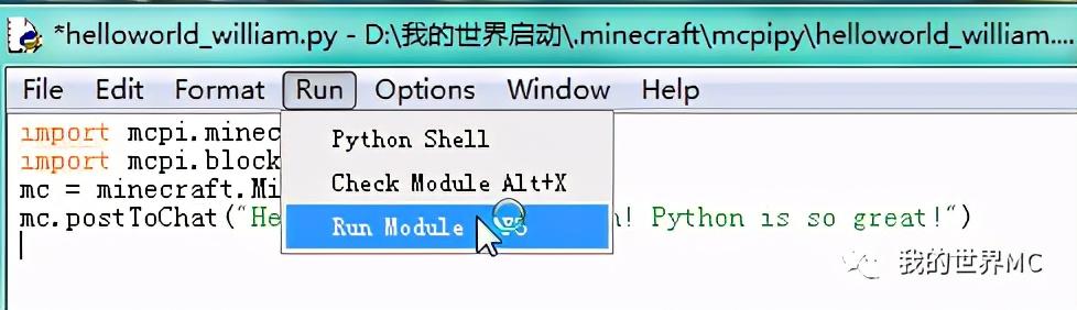 将文件保存为D:我的世界启动.minecraftmcpipyhelloworld.py,并运行
