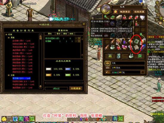 打造初级的普通时装,需要相应的时装图纸和软猬鳞。打造高等级的时装,需要图纸、软猬鳞和金蚕丝。你想打造哪款时装,就去服装师处点击该款时装,然后会出现需要的原料以及数量的需求。然后要按要求去将相应的原料放入自己的包裹中,再加“+”号,把原料全部放入,再消耗一定数量的银子就能打造成功。