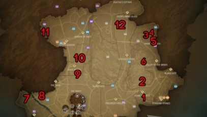 想要找到所有肖的日志需要先解锁4个力量咒语(用于解锁隐藏区域),集齐所有日志后会触发与阿加莎的剧情动画,获得1把奥术钥匙并解锁新的眼睛颜色。下方为对应日志编号的地图(可对照参考下文放出的具体位置图片)。