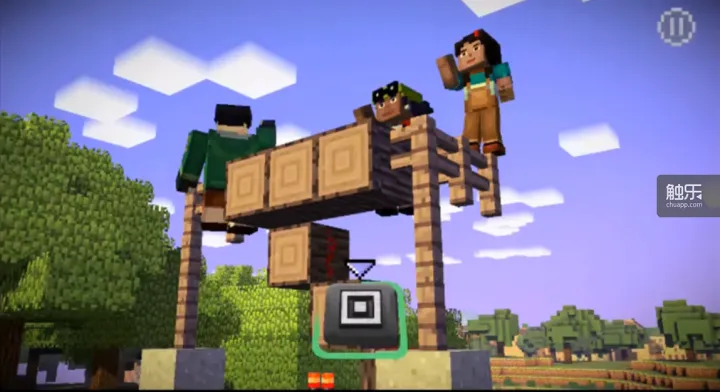 在主角一行参赛后决定建造什么时,画面就会出现一组蒙太奇,就像武侠电影中常见的练功剪辑。在此处,所有普通MC玩家的日常行为都会一一展现,从最基础的拳头撸树到修建房子,然而Telltale用最简单、最快速的QTE操作把这些行为都略过了,几乎明确了游戏的方向:把耗费时间的复杂操作省略,重心放在控制讲故事的节奏,就像许多电影所做的那样。伴随着轻快的BGM以及不同工作场景的剪辑,Telltale试图唤起MC玩家的日常共鸣。但也许正是在这个地方,不能忍受无自由度的玩家却开始流失了。