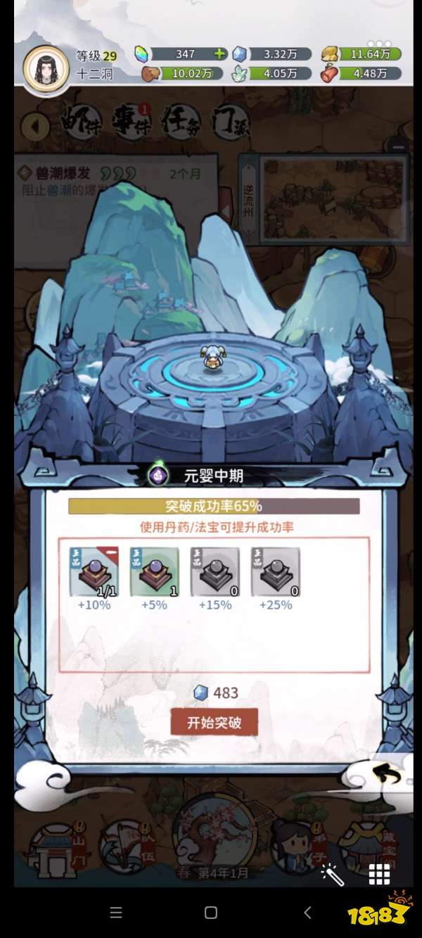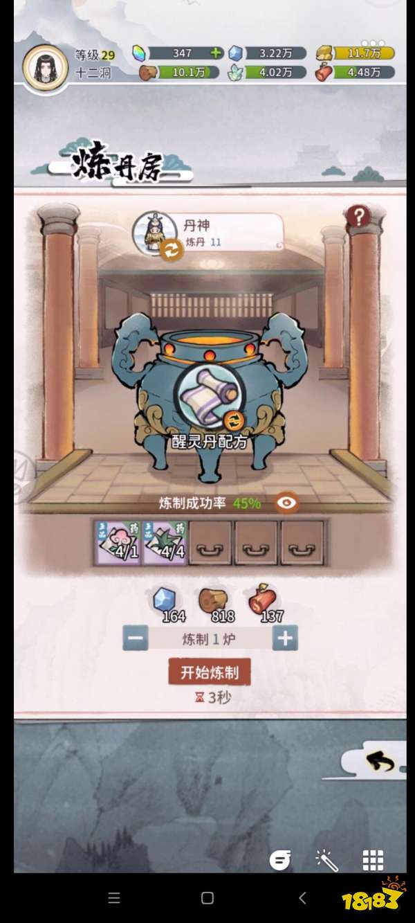 2.元婴突破的成功率那叫低的一个离谱。我掌门金丹大圆满失败了4次才进的元婴。在元婴更是无限失败。拿到醒灵丹的单方后。直接好家伙。15的农耕可以让你4小时炼丹一次。11的炼丹。成功率45。大家懂了吧。