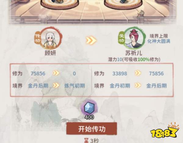 收获完后我们再用复灵丹进行救治后开始转移修为(温馨提示不建议转移到小师妹及掌门,因为传功每个弟子进行一个可以先转移到潜力超过9的弟子。)