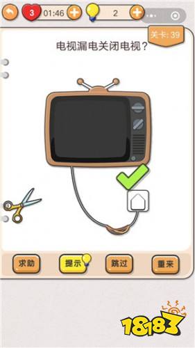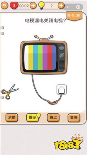 题目称电视机漏电了,要求我们关闭电视机。首先剪刀是不能使用的,用剪刀剪断通电的电线是很危险的,而且完全没有必要。其次就是插座了,很多玩家都会选择怕掉插头,但是点击插座之后没有反应。这个时候我们还有一个选择,那就是关闭电视的开关,这个按钮就是电视机的右下角,点击一下就可以了。