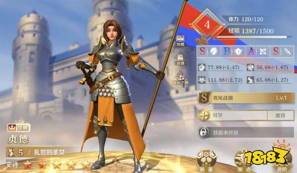 英雄为贞德,自带技能是主动技,对敌方单体发动1次战术攻击,并有概率额外发动1次战术攻击。