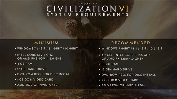 《文明6》是一个大地图策略游戏,因此随着游戏进程深入,建筑物、城市以及事件也会大量增加,这些内容都将增加处理器和显卡的运算负担,内存资源占用也会暴涨,而官方在2020年5月已公布了《文明6》的最低配置与推荐配置,其硬盘空间要求均为12GB。