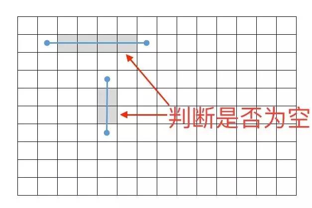 第1种直线判断很简单,就是2点之间的是否全部是空的单元格。如下图所示: