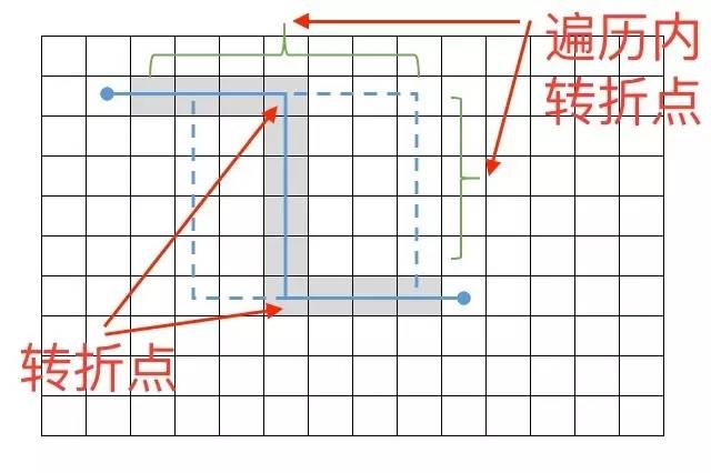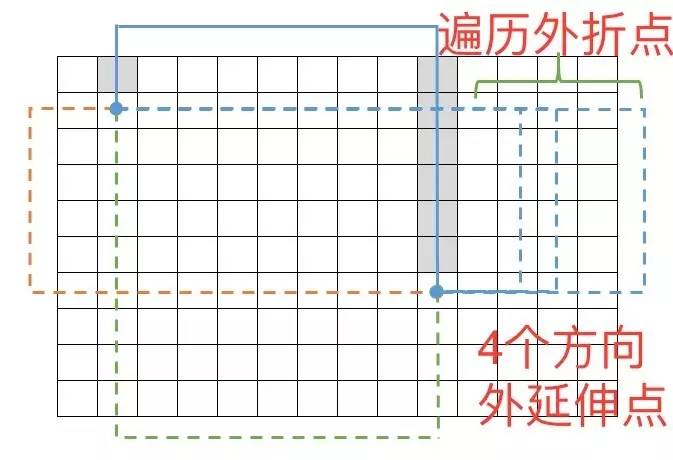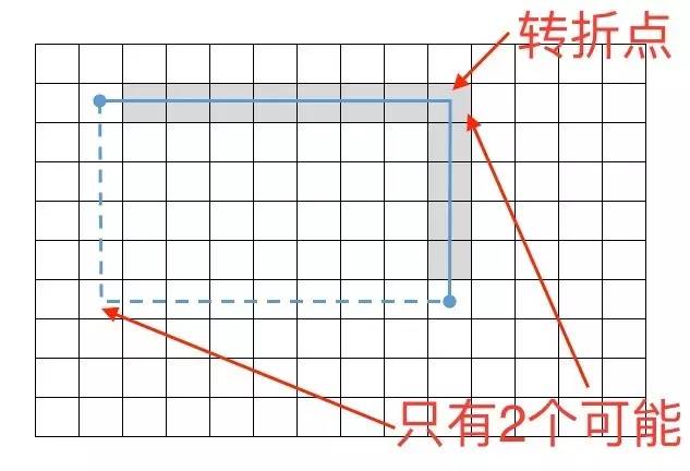 第4中双折回线,就是便利2点对应的棋盘外的区域的4条边的所有能组成3段直线的2个转折点,再分解为判断3条直线。如下图所示:
