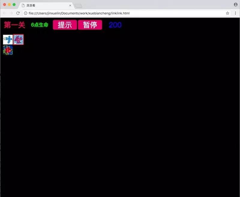 游戏还有一个功能是可以提示,当很长时间都无法发现可以连接的情况下,为了节省时间,可以消耗一条命,让程序提示可以消掉哪2个图片。