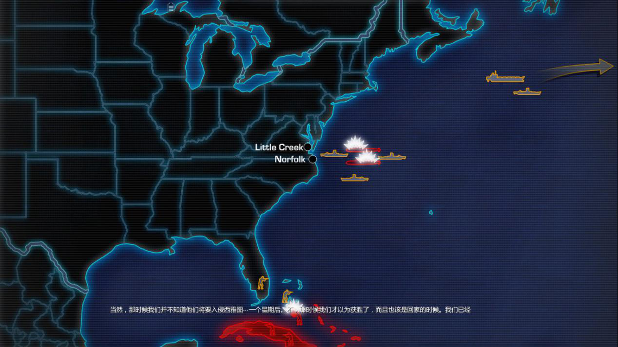 ▲游戏过场CG中,美国海军在东海岸拦住了苏联核潜艇,但是西海岸的美国舰队到底怎么完蛋的不得而知,以至于要拉出"密苏里"号战列舰去支援主角所在的美军部队