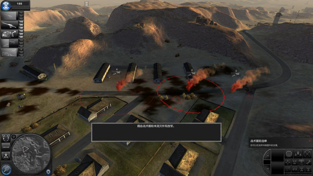 战术支援菜单实际上是玩家要认真注意的,因为游戏过程中战术支援是玩家最为倚仗的。进攻和防御都可以召唤空军或火炮席卷敌军,小到空投伞兵,大到战术核弹,都可从战术支援菜单中呼叫出来。战术支援需要相应的点数,点数需要通过战斗不断积累,每一种战术支援同时可进行三次。战术支援因应不同的敌军目标,无论是打击碉堡还是摧毁坦克,都请玩家在游戏中因应战场情况判断。