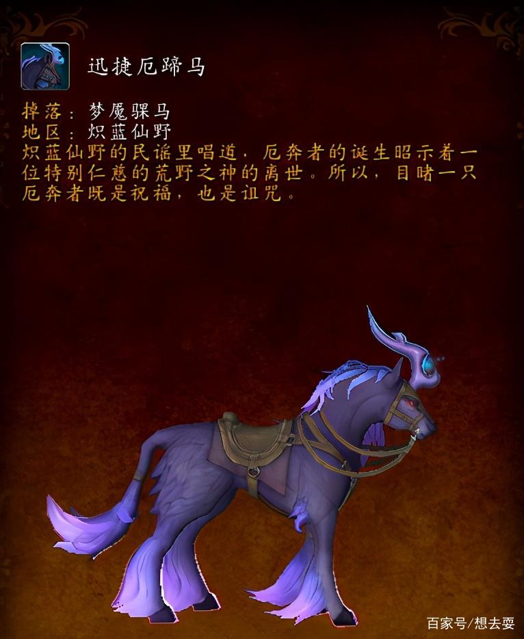 这个坐骑是最最简单的,但也有限制,这个只能是盟约选择了法夜的玩家才能拥有。战役任务点击就送,这个有4种符文牡鹿和4种魔化的符文牡鹿,战役任务会送一只梦光符文和魔化梦光符文,而其他的类别则需要玩家花费心能在名望军需官处购买。