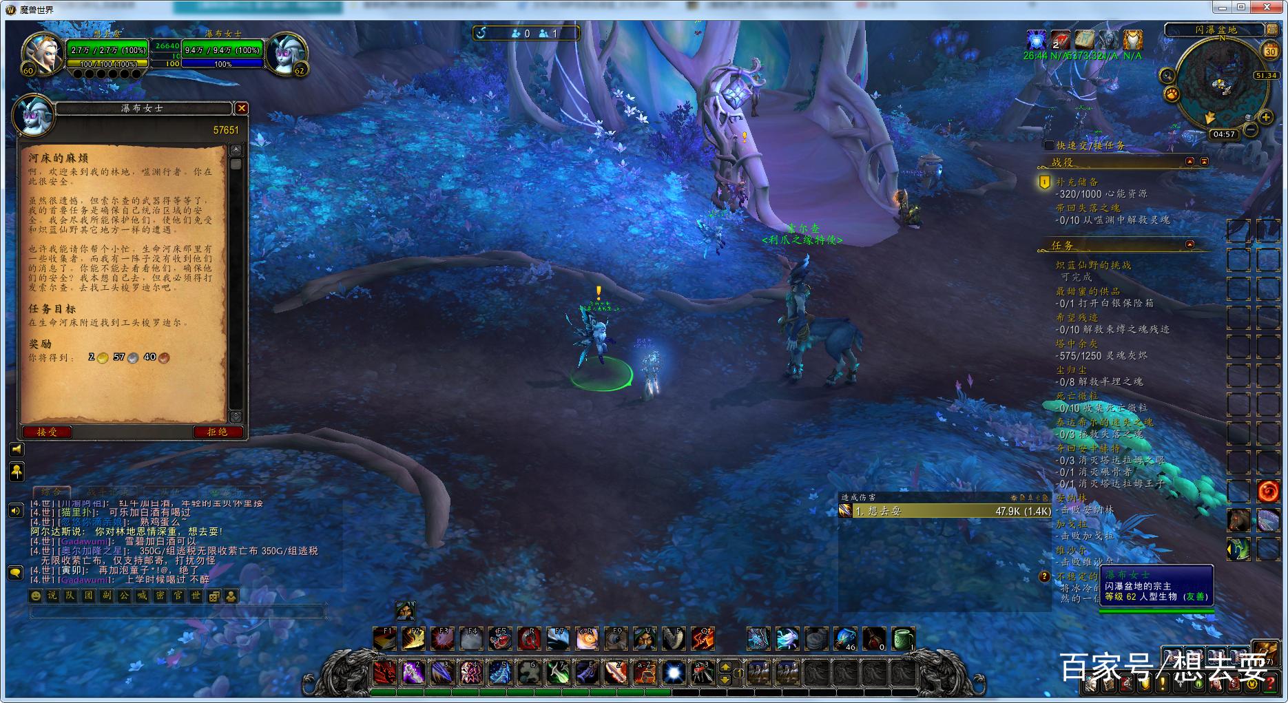 然后跳到树干上,拥有位移的职业都可以简单地过去。上去后在一个马车下面有一个开裂的魂网可以拾取。拾取之后回到坐标(50,33),找到npc格温娜。格温娜要把直线任务做完才会出现,我们需要到瀑布女士哪里接取“河床的麻烦”直到做完,然后到翩猎(48,24)再接后续。