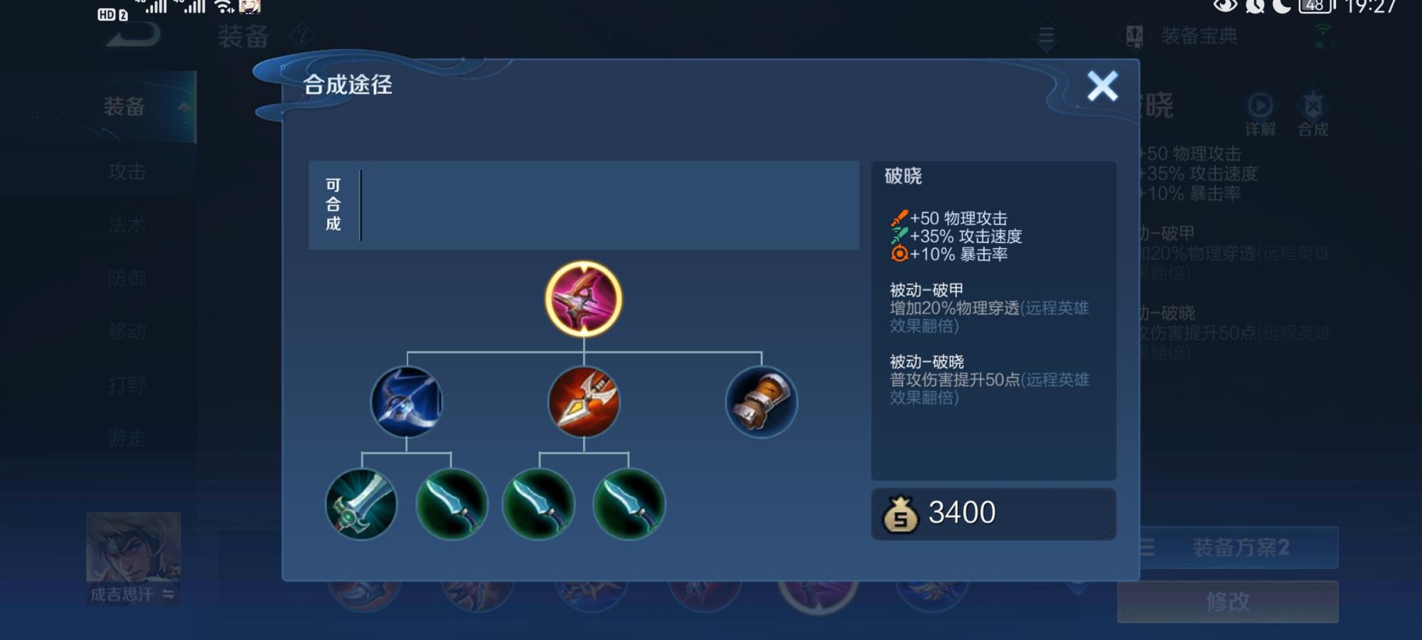 射手神器破晓,几乎是每个射手必备装备,虽然这个装备略贵,但是它可以给射手提供的属性实在是太好了,50物理攻击,35%攻击速度和10%暴击率,同时还有装备被动破甲和破晓,增加40%物理穿透和普通攻击伤害提升100点,这对于主要输出手段为普通攻击的成吉思汗来说简直就是神器。