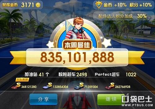 到达第二站油依然是满的所以就浪费了,再来就是末日,马达开局的大喷原本分数就高了但是却要给技能换成超车分数,我想该没有人末日,马达用惊险超车配件吧!