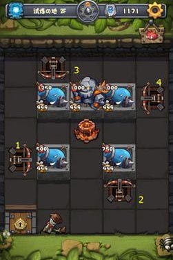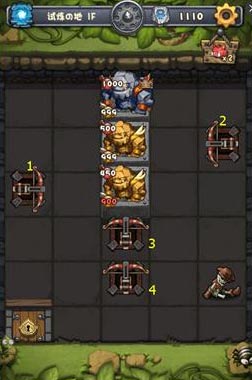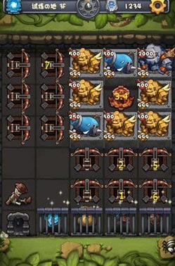 在第一层中,有三个石头怪,血量分别是450、500、1000,攻击都达到了900以上。除了三个石头怪外,还有四个弓箭在周围,而玩家们要做的就是利用这些弓箭消灭石头怪。玩家只要按照图中的顺序使用弓箭即可轻松过关。