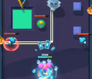 奥义冰-消耗卡牌是给自己套一层盾,当盾消失的时候会连续多次发射全屏冰弹,同时,给人物加上防护盾(图中人物血条是蓝色的就是护盾)。注意,重点来了,当你再次消耗卡牌,上次加的盾效果就消失,这样就造成了下图这样的情况。非常给力!!!