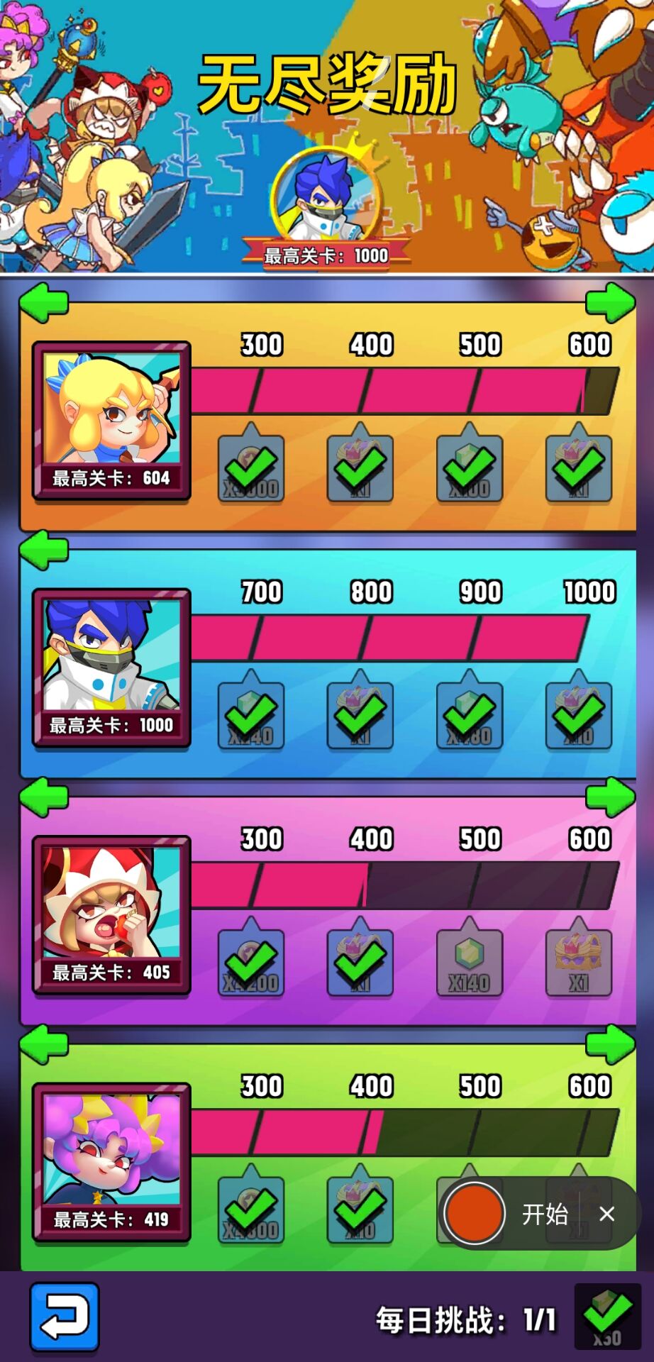 还有一个最最重要的,它有无尽模式!不是100,不是1000,打得过的话你打100万层都行。由于最高奖励就到1000,所以游戏菌只打到1000层。