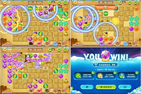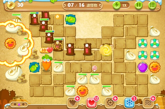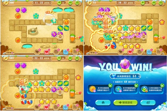 随着游戏的进行,特别是在清除全部道具后,可以多安装炸弹星炮塔,提高消灭怪物的能力。值得一提的是,本关有一些隐藏炮塔,除魔法球塔外,还有磁铁炮塔,升级磁铁炮塔,可以获得更多金币,多安装炸弹星塔,即可消灭所有来袭怪物,获得道具全清、金萝卜和钻石全部成就。