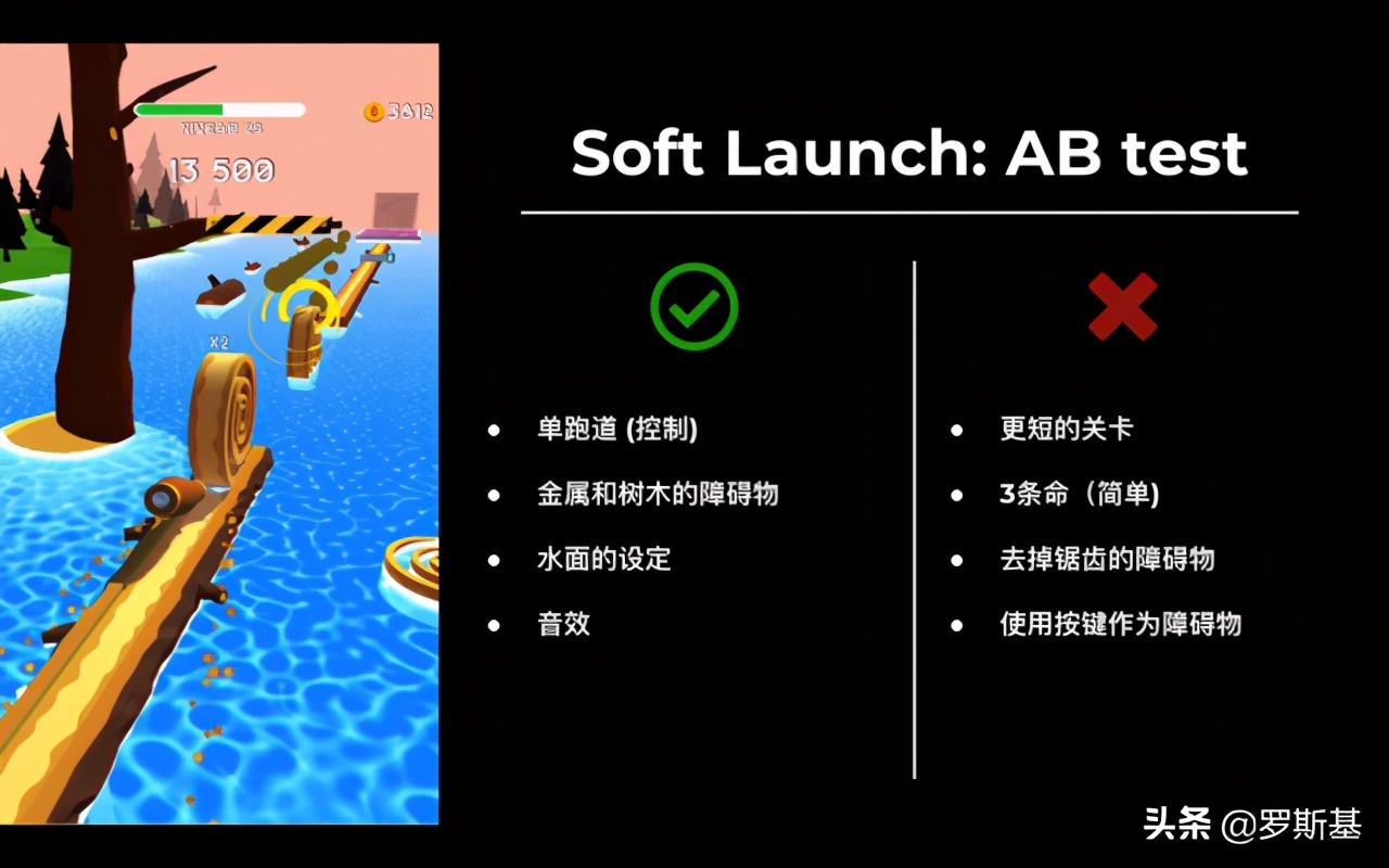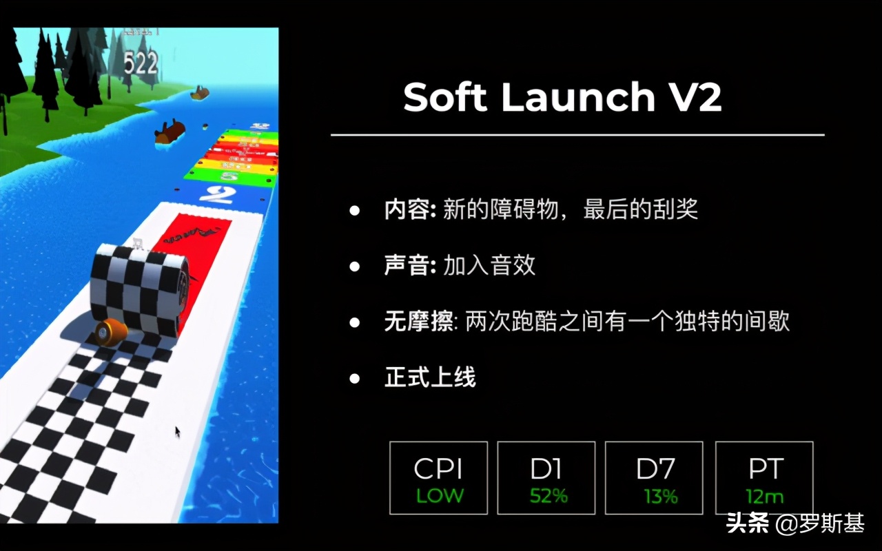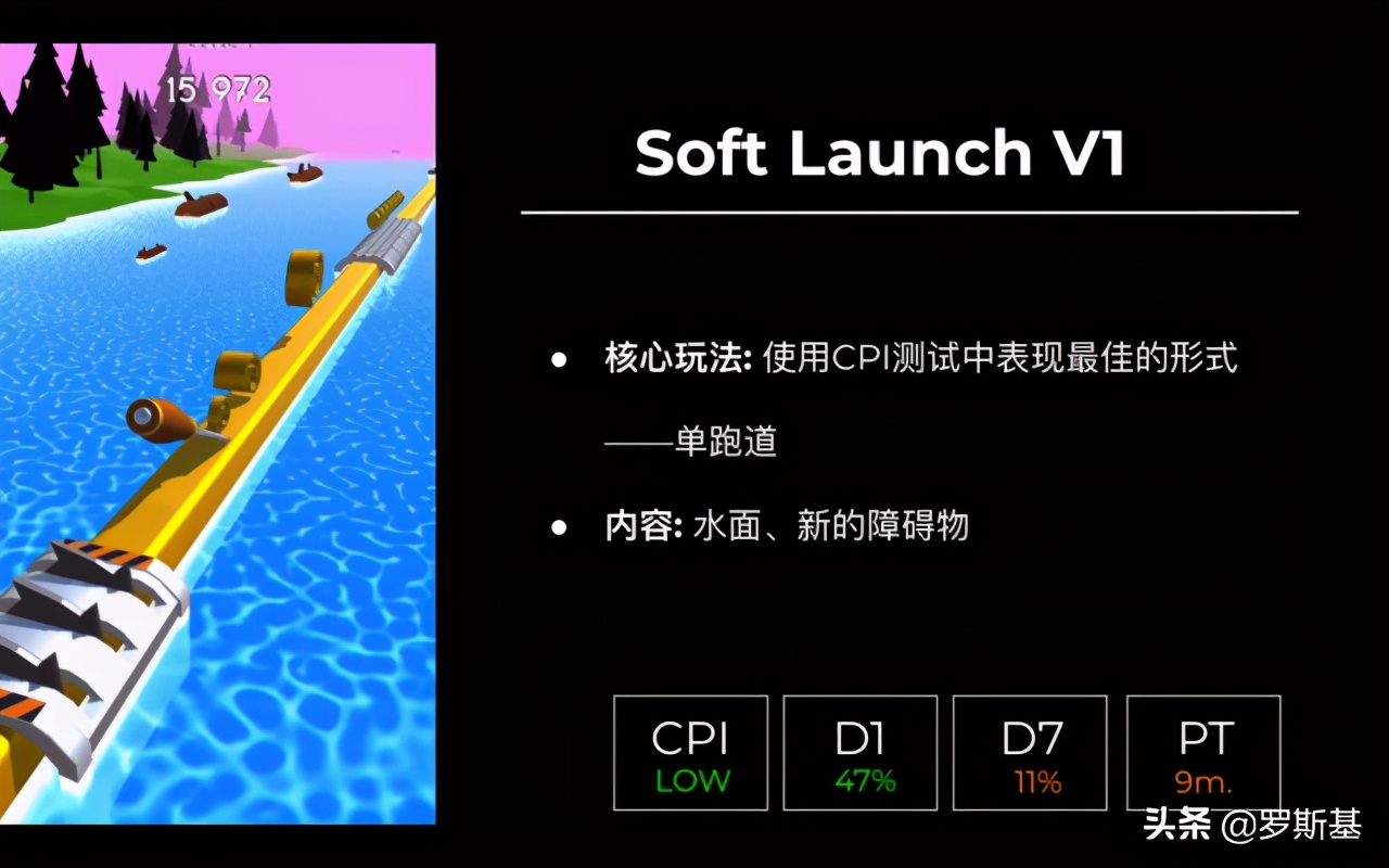 之后产品进入到Soft Launch阶段。上线阶段我们把CPI表现最佳的形式作为了游戏最主要的玩法,因为这是用户最买单的,同时引入了水面和新的障碍物,这些都是经过多次AB test后得到的结论。可以看到,这时游戏的七留进一步提升,游戏时长也有增加。