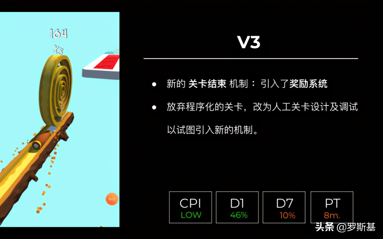 强调一下无摩擦,在两次跑酷期间加入了特殊的结算界面,这是在超休闲游戏中很少见的。在《Spiral Roll》中单独加入这个界面,让两次跑酷之间有独特的间歇,让用户可以清楚知道自己的得分。这个阶段的次留达52%,七留13%,游戏时长12分钟,都是非常优秀的数据。