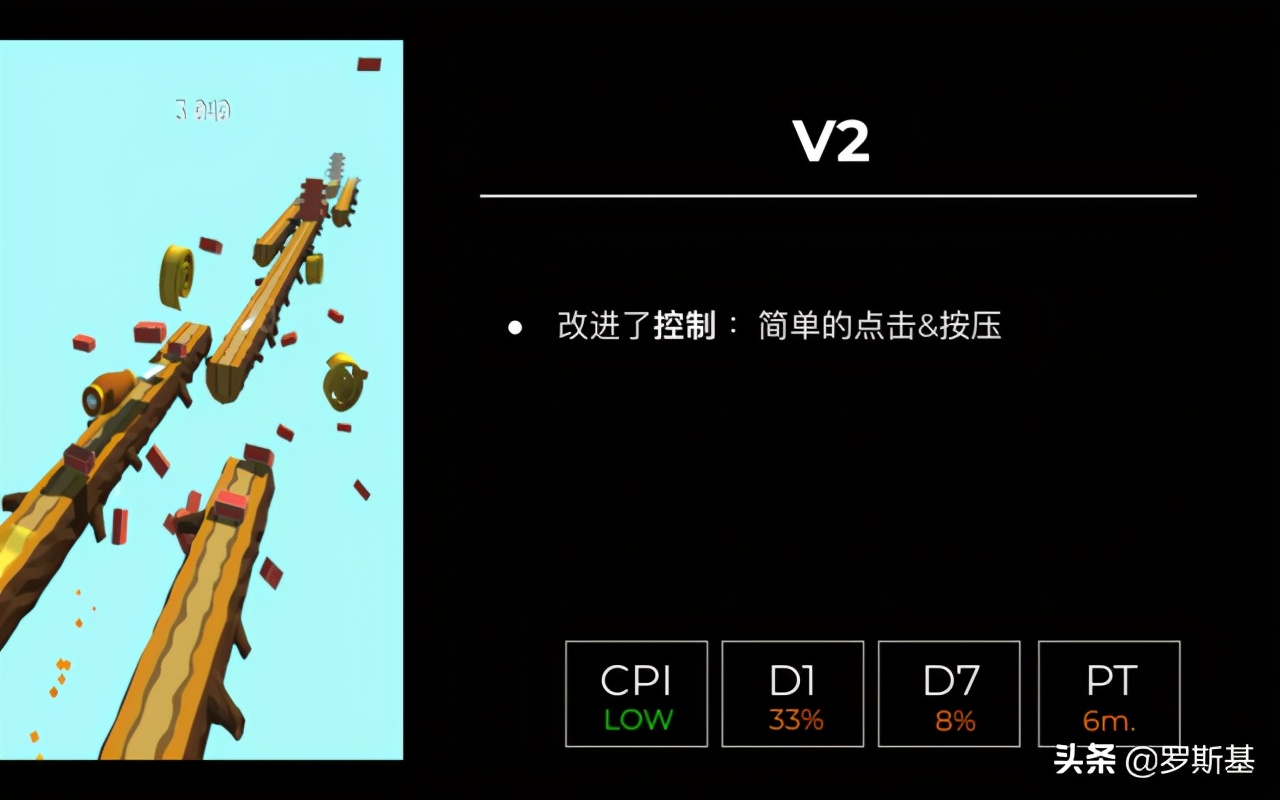 很快进入到第二个版本,这个版本最大的改动的控制方式,点击按压和松手成为用户唯一要做的事情。简化操作后可以看到,次留、七留和游戏时长都有明显提升。