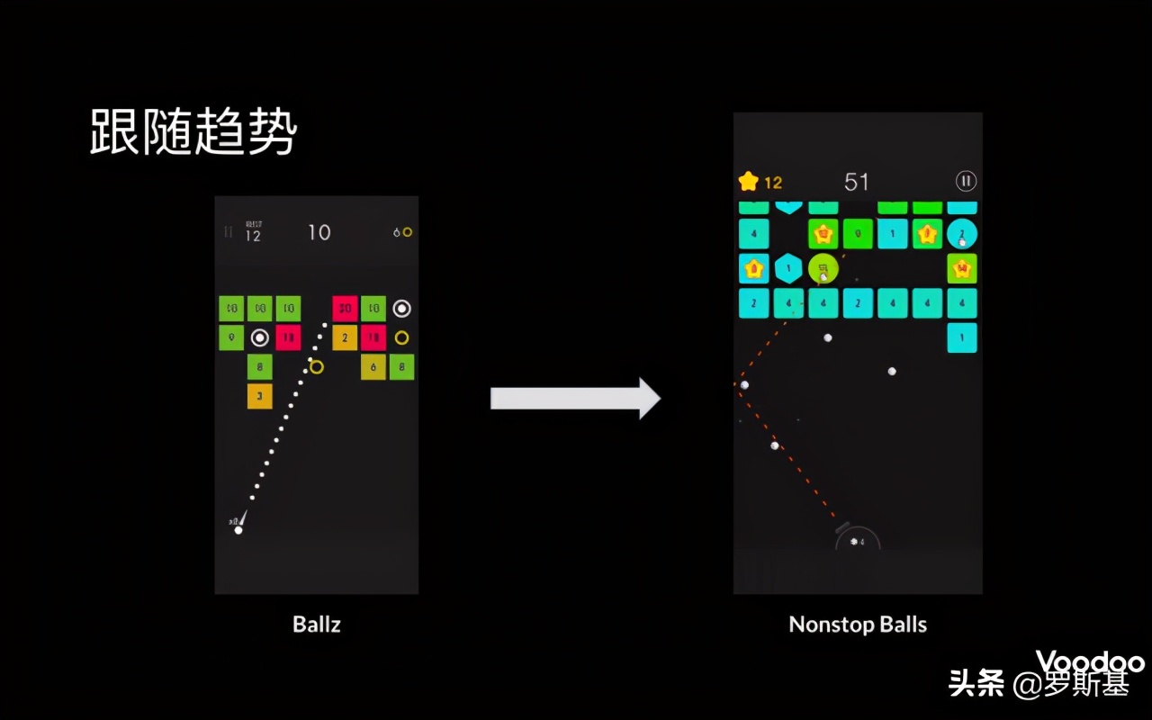 所以跟随趋势通常是这样的。先出现一款受欢迎的游戏,如左边ketchapp发行的《Ballz》,几个月之后另一个开发者想出一个基于《Ballz》的游戏,就像右边的《Nonstop Balls》。
