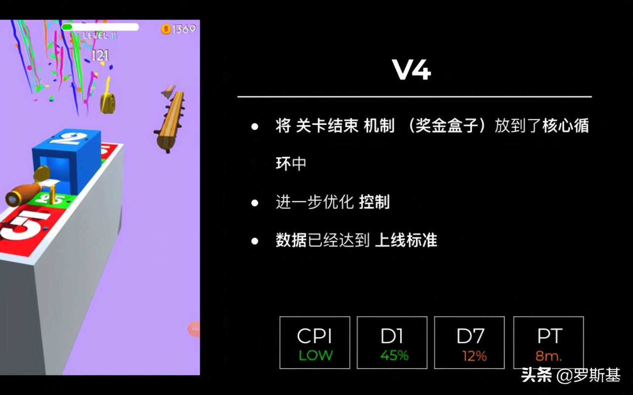 进入第四个版本后,我们做了一个改动。在V3中加入的关卡奖励机制受到用户欢迎,我们在V4版本中直接将奖励盒子放到了游戏的核心循环里,并且进一步优化控制,让游戏数据达到了上线标准。