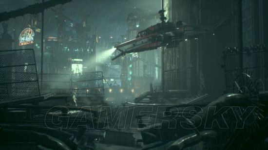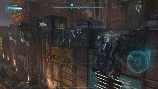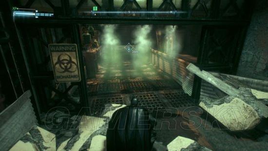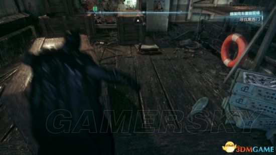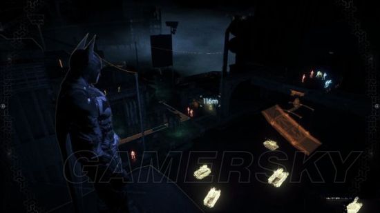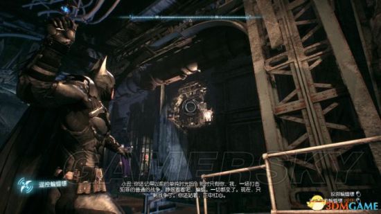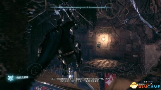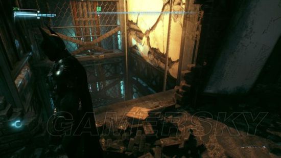 step6.外出到露台,在右侧可以拿到谜语人的谜题(收集所有谜语人的谜题,最终可以逮捕谜语人,猫女的支线任务只能解救她,算是完成谜语人的支线任务一半内容,另一半则需要进行大量收集解谜)翻过护栏落到横梁上,这时候因为蝙蝠车无法进入到这段隧道中,因此只能让蝙蝠侠独自潜入。