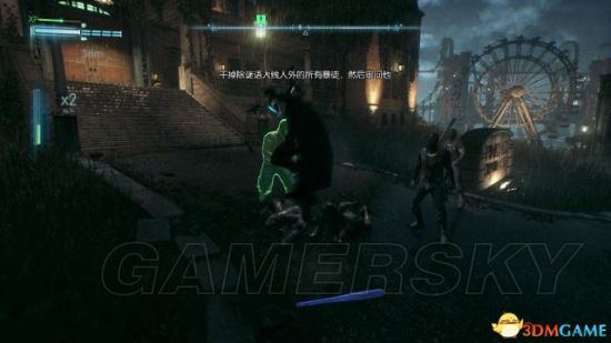 step4.在钟楼附近有一支佣兵部队,哥顿局长先待在车内,而蝙蝠侠要先清理该片区域。