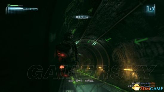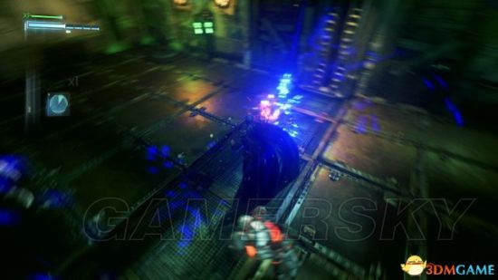 这一步还未完成,远程控制蝙蝠车,观察3号闸口下方二层位置,继续侧向行驶,务求令到三号闸口下方二层的锯齿机关被移开,方便之后从3号闸口作绳降。