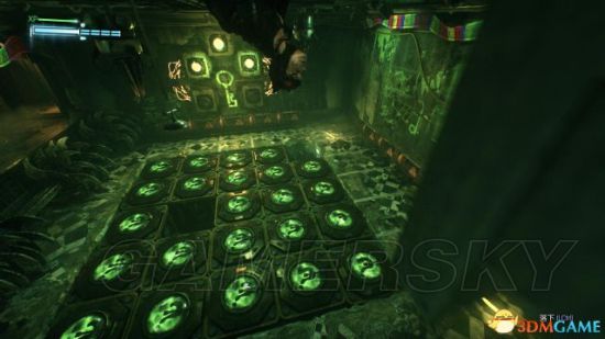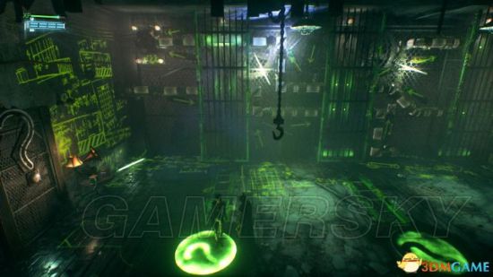 step18.水位降至最低,蝙蝠侠跳到底部的装置上,然后抬头就可以看见第七把钥匙的位置。