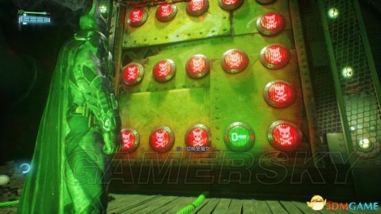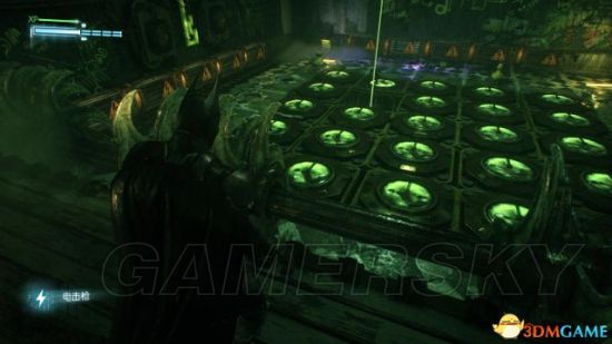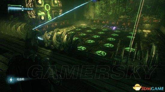 先让猫女跳到天花板上并落到激光装置区域内,猫女站在压力板上,而蝙蝠侠可以利用电枪射击两边的发电机,令到这些问号装置移动,而被猫女所站的压力板不会受影响(不动)。