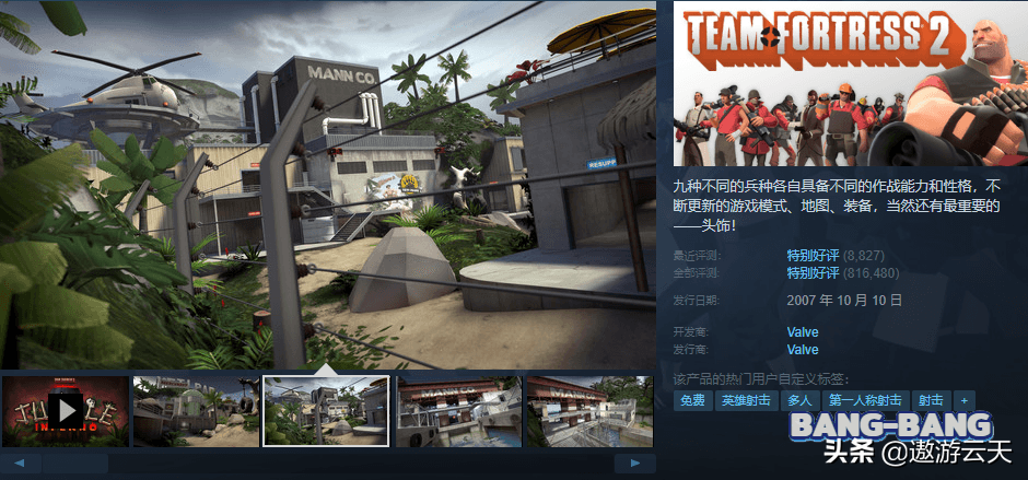 《军团要塞2》Team Fortress 2,一款FPS游戏,游戏玩法特别好评,各种不同职业的角色,有间谍、工程师、医生、炮兵等,画风和惊奇的玩法也让这款游戏常年在在线游玩榜前十。