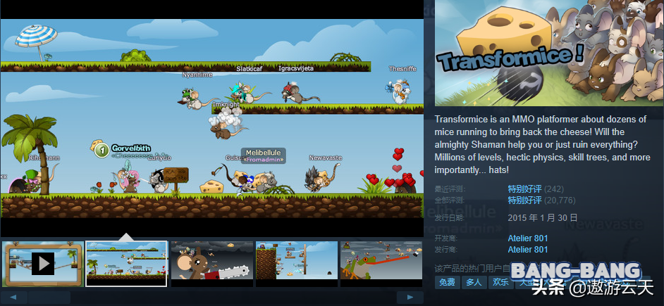我在Steam上玩的第一款免费游戏《Transformice》当时记得我是看到这个直播我才去玩的,特别的搞笑,游戏内你扮演的是一只偷奶酪的老鼠,你的目的是把偷到的奶酪,运送到洞里去就成功了。