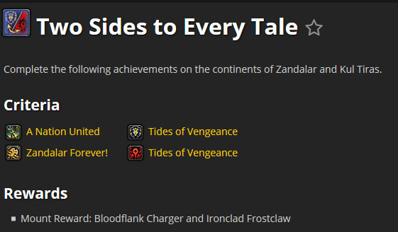 成就要求完成双方的8.1复仇之潮战争战役,以及主线剧情“统一的国度”和“赞达拉万古长存”,也就是说你必须双方阵营都有120级角色并且做完这些任务。