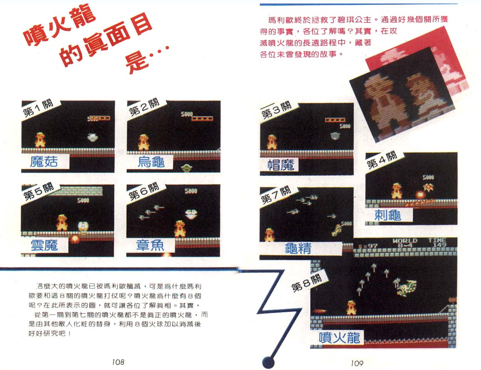 喷火龙库巴,知道马里奥要来营救公主之后,用魔法将小弟变成了自己的模样镇守在各个地区的城堡中。我们要是使用火球将BOSS打死的话,就会现出真身。要是你没有子弹,那就只能将桥踩断了。