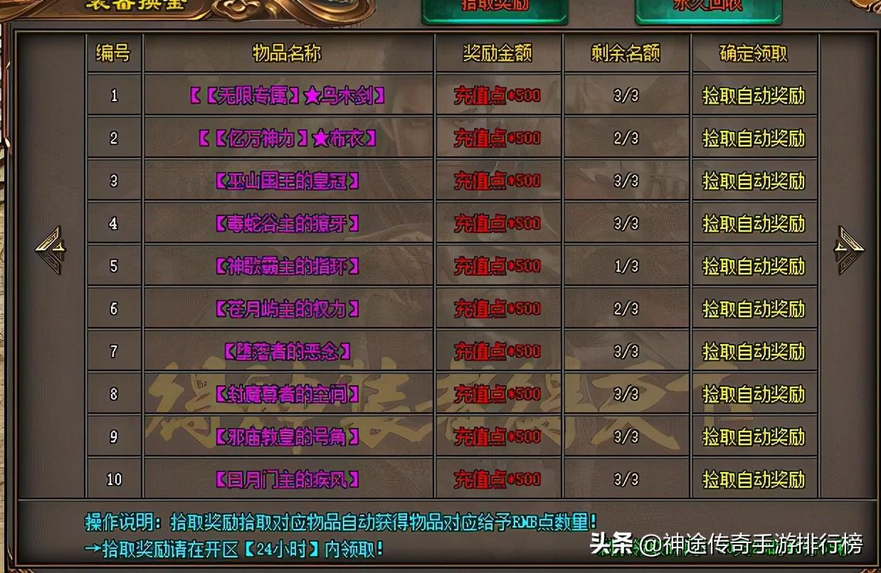 装备回收可以获得元宝,装备换金里的拾取奖励和永久回收装备可以获得充值点。