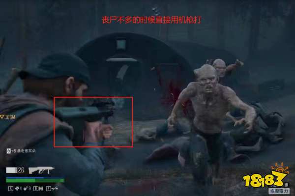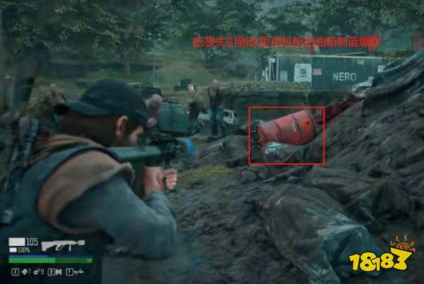 3.往前跑然后回头,等尸潮到油箱附近时,我们用机枪扫油箱制造爆炸炸伤丧尸。
