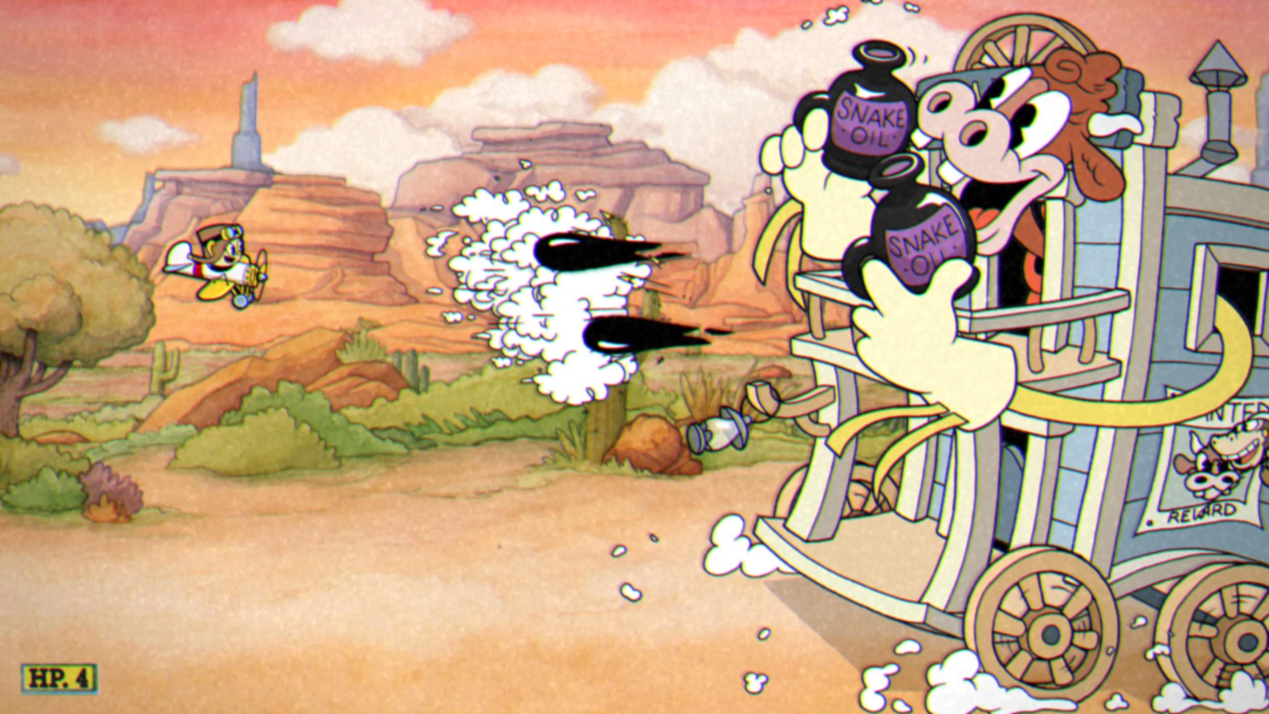 同样类似于本篇,DLC的BOSS也有很多neta和联动元素,比如在汪牌飞行员这个关卡就是联动的《汤姆与杰瑞》中的大狗,大狗还会把汤姆作为武器来吐出毛线球,相当恶趣味的捧腹观感,又比如母牛关应该是致敬了《米老鼠》中的母牛克拉贝尔(这一关也是DLC唯一的飞行关卡),所以这样一种攻关过程除了本身的趣味性,也有着一种童年动画体验的情怀加持。