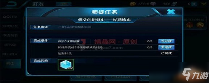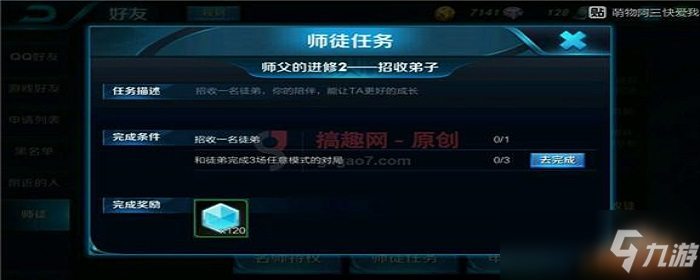师徒任务2:徒弟达到9级,使用坦克/战士型英雄参加三局比赛并与师傅共同完成两局比赛,推荐师徒共同参与三局33简单人机模式即可。