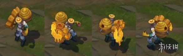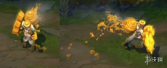 炼金化身养蜂人,身背蜂房,放毒也变成了撒蜜和蜜蜂攻击,想想被蜜蜂群蜇的感觉就很疼啊。回城的特效更残暴,一只表情搞怪的蜜蜂撕裂辛吉德的身躯飞回家,只剩下没有头的养蜂人(回家之后就正常了)。