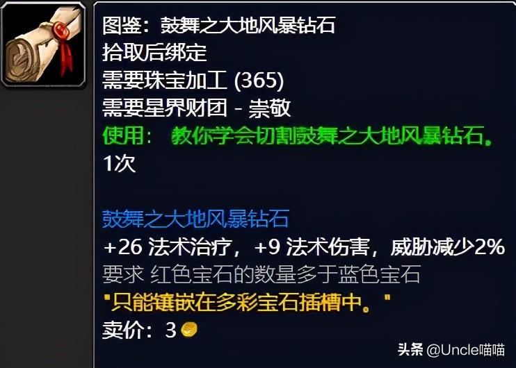 星界财团珠宝加工三剑客中的最后一剑,就是我们的鼓舞之大地风暴钻石可以说是治疗必备多彩插槽的石头了,26的超高法术治疗加持以及2%的威胁值减少都堪称经典,治疗必备石头前期,推荐指数满天星辰直戳天花板。